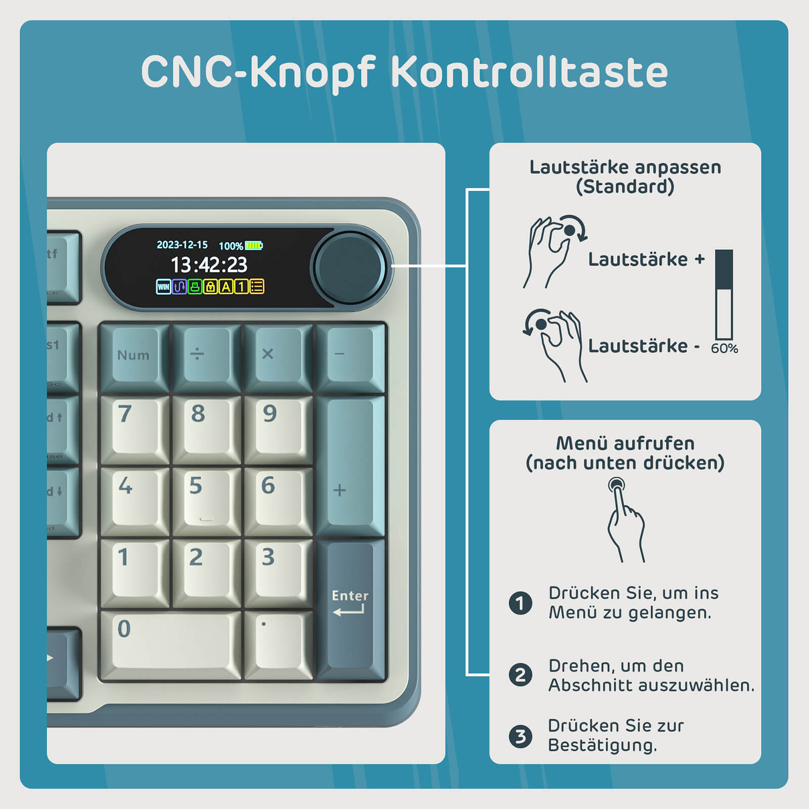 Lautstärke, Verbindungsmodus, Helligkeit / Geschwindigkeit der Hintergrundbeleuchtung, RGB-Modus/Farbe, alles, was Sie brauchen, ist nur ein Drehen oder ein Klick.