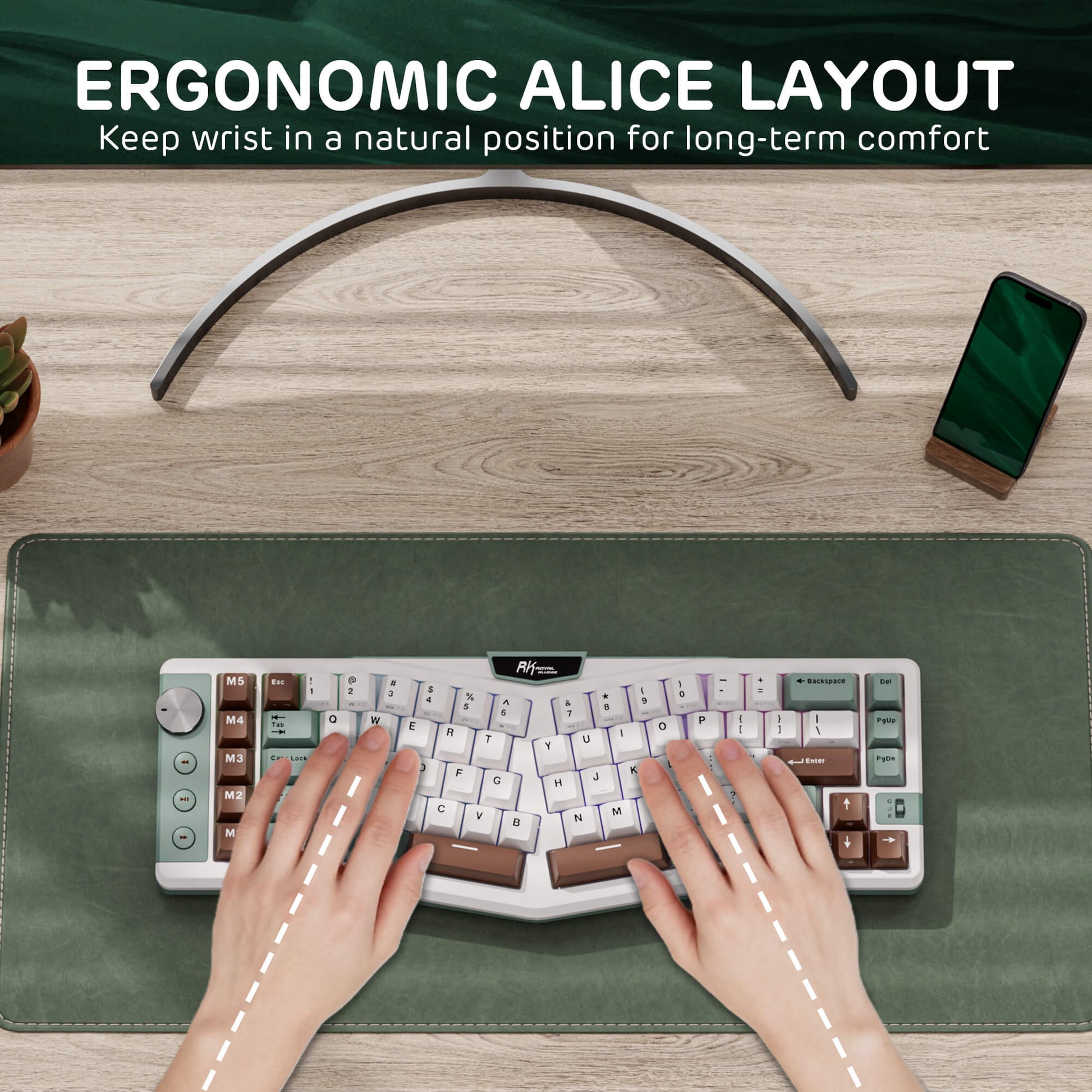 This 72-key Alice keyboard features a split, angled design that promotes a natural typing posture to reduce wrist and forearm strain, minimizing fatigue during extended use. Compact 68% layout saves desktop space while keeping functional arrow keys. Seamlessly blending ergonomic wellness with high-performance typing.