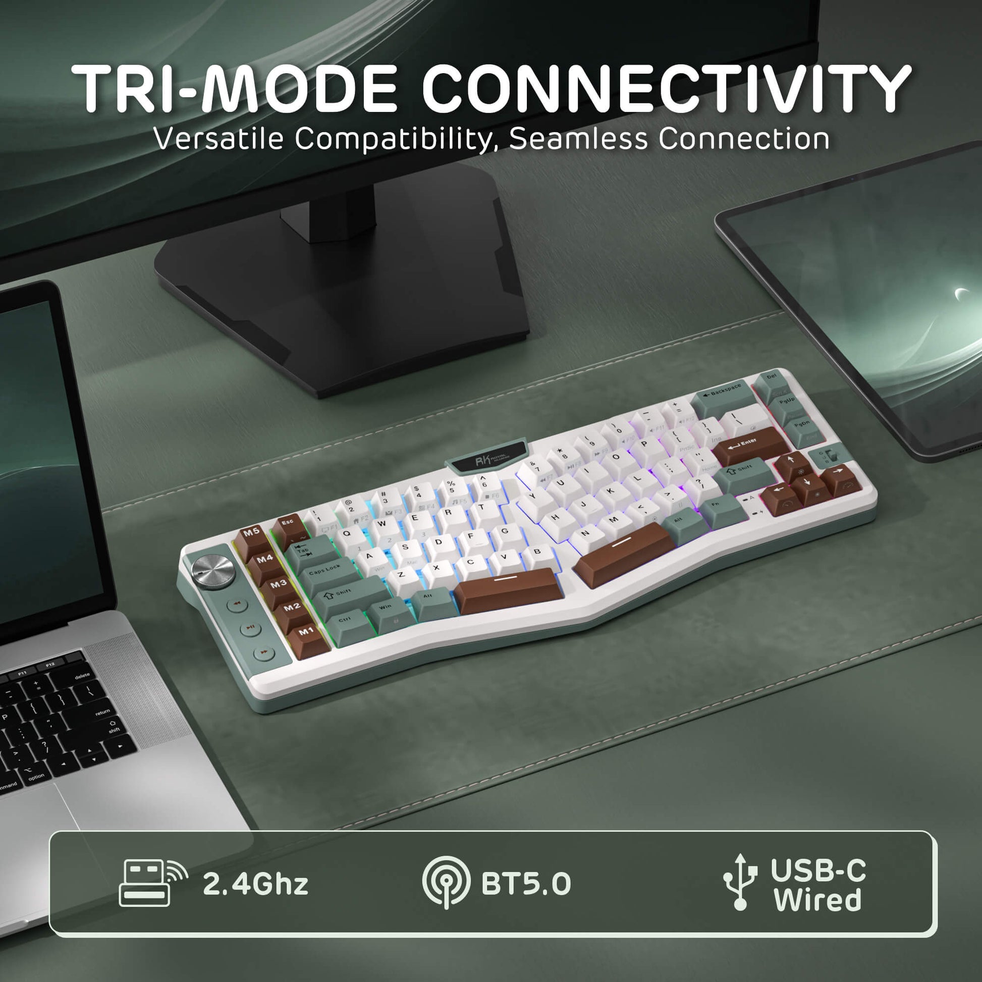 Easily switch between 2.4GHz wireless, Bluetooth 5.0, and USB-C wired connections using the toggle switch. The RK A72 supports multi-device connectivity and features 15 dazzling RGB backlit modes for vibrant effects.