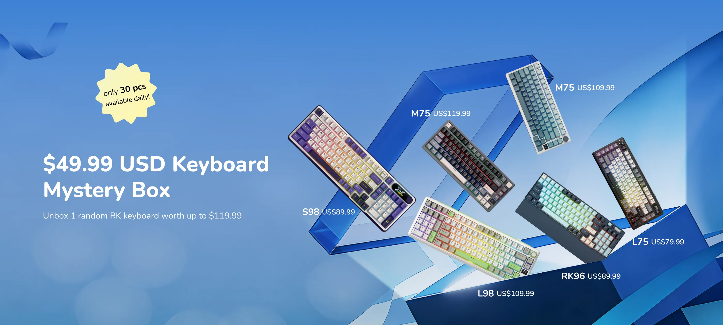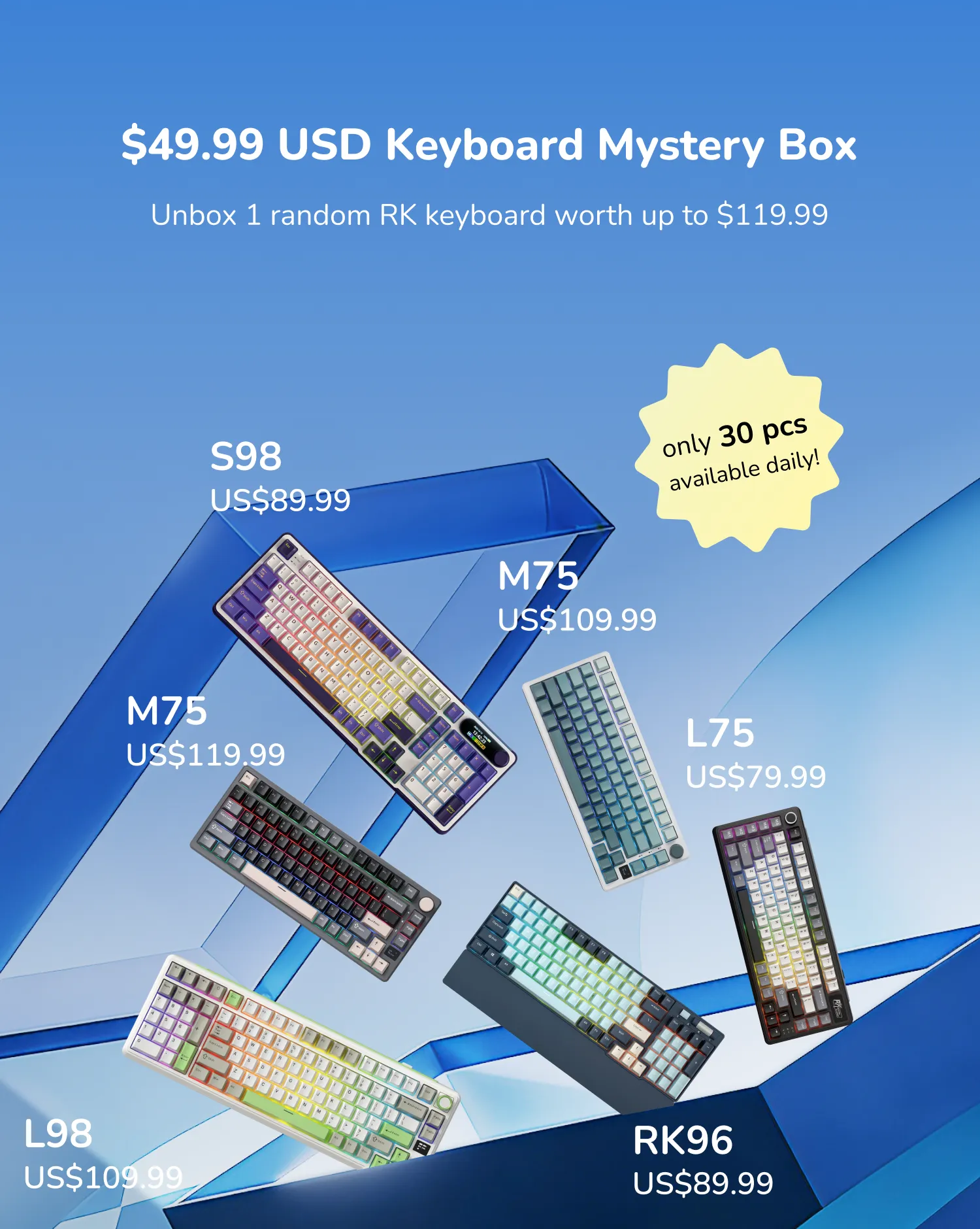 RK 5th Anniversary Mystery Box 🎂 We made it to 5 — and it wouldn’t be the same without you. Grab a surprise keyboard for just $49.99 USD. Each box packs one random RK bestseller — you could score an S98, L75, M75, RK96, or L98, valued at up to $119.99 USD.